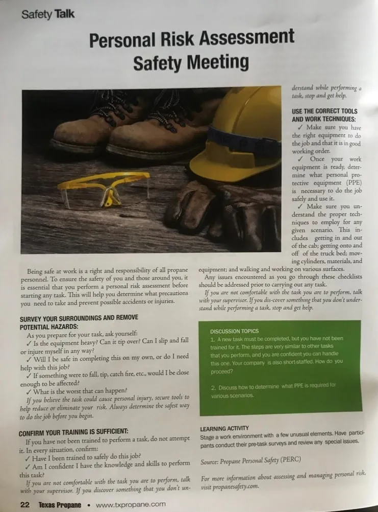 Check out this month’s issue of the Texas Propane Gas Association magazine which reminds us of the importance of Personal Risk Assessment – a Propane Education & Research Council safety program, developed with the help of our VP of Safety and Training, Mike Walters.